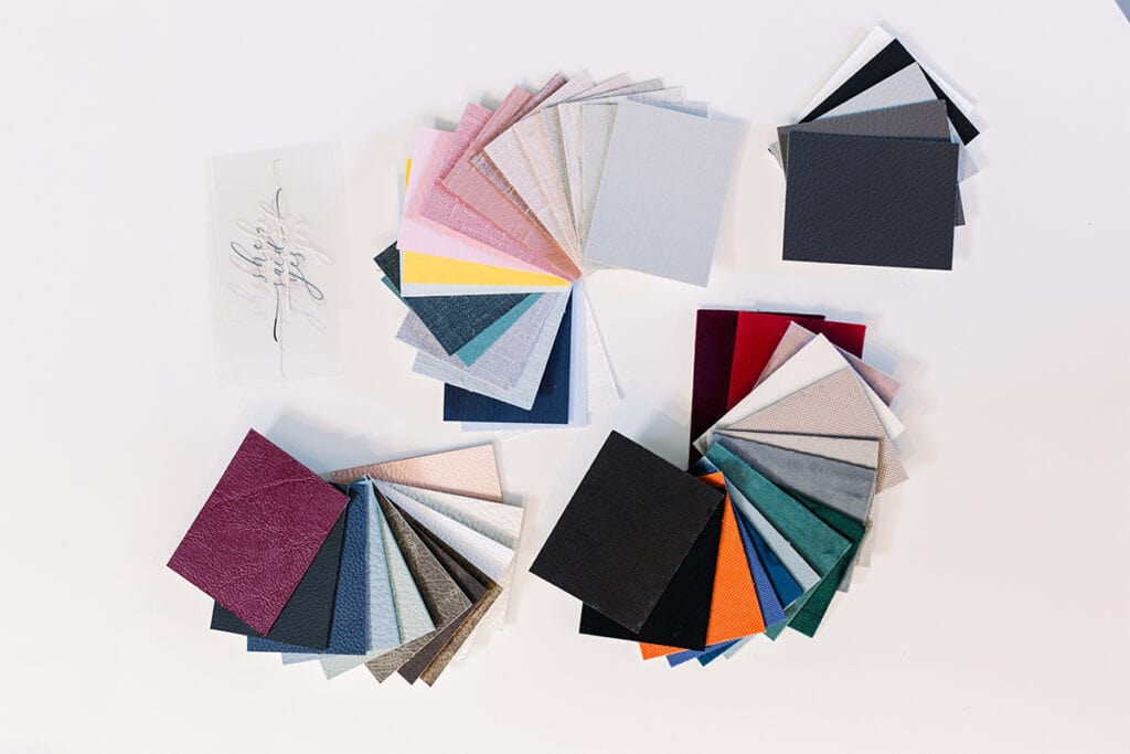 Full swatch collection, including all our material options and foil embossing examples – make album consultations a breeze!